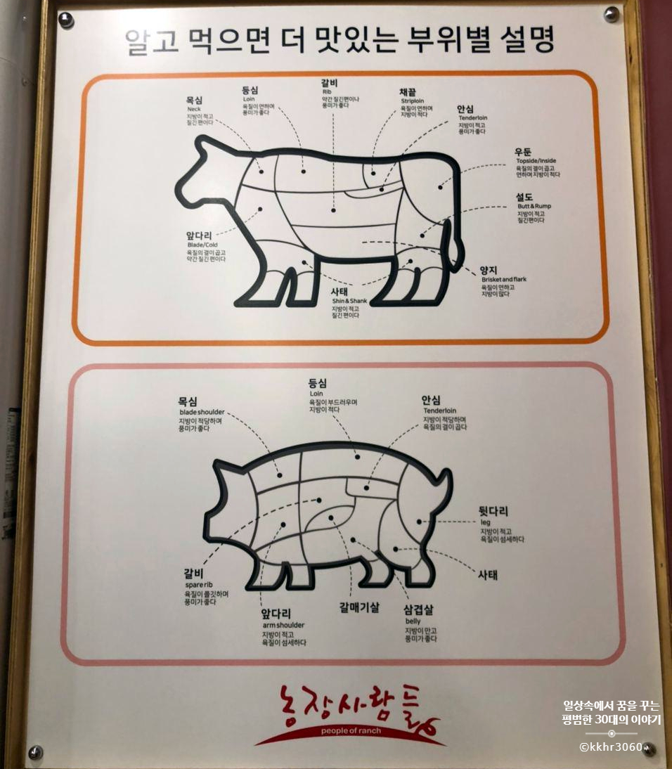 초보 주부인 나는 보통 정육점에 가면 사장님께 어느 부위를 사겠다고 하지 않고 무슨 요리를 할 때 사용할 고기를 사고 싶다고 한다. 그러면 사장님께서 알아서 부위를 선별해서 주신다. 그러다 보니 부위별 이름은 봐도 봐도 여전히 생소하다. 언제쯤이면 각 부위별 이름과 특징을 술술 외게 될 날이 올까.