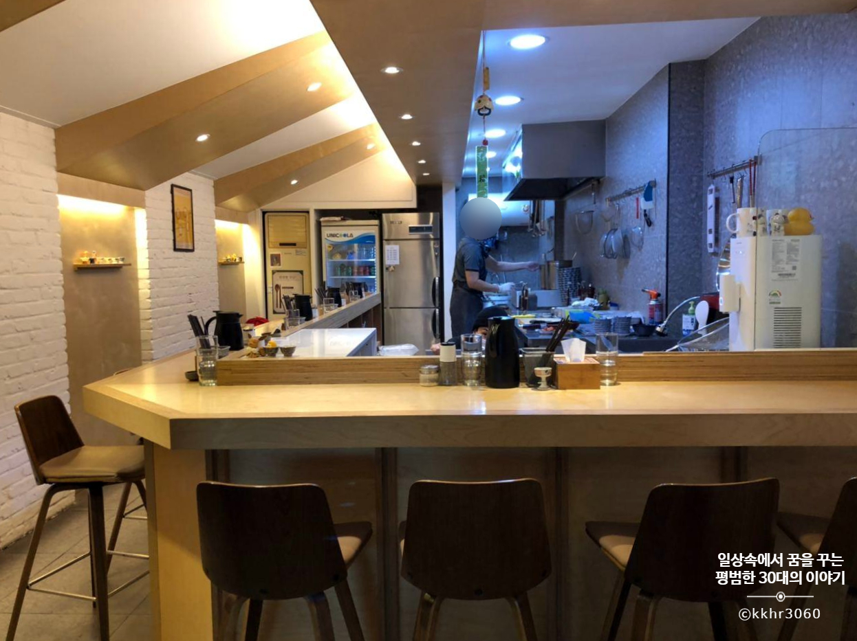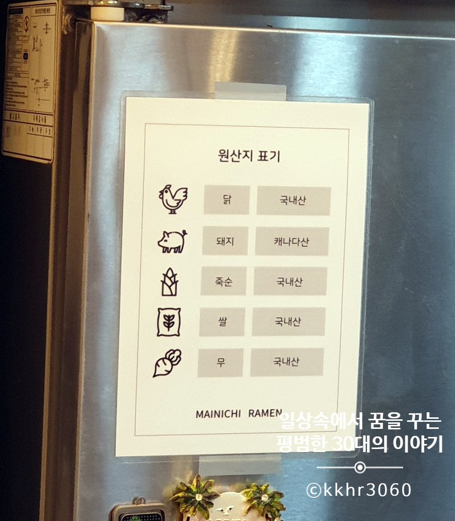 오늘도 주위를 두리번거리며 찾아낸 원산지 표기! 돼지를 제외한 나머지 재료들은 국내산이다. 돼지고기가 캐나다산인데 아쉽지만 모두 국내산을 사용하면서 이 가격으로 논현동에서 라멘집을 운영한다는 건 쉬운 일이 아닐 것이다. 저녁을 먹기엔 살짝 늦은 시간이라 손님이 우리뿐이 없었다. 인스타그램에 보니 평상시에는 이 동네 직장인 손님이 많아 점심 장사만 하고 영업을 종료하는 경우도 종종 발생하는 것 같았다.