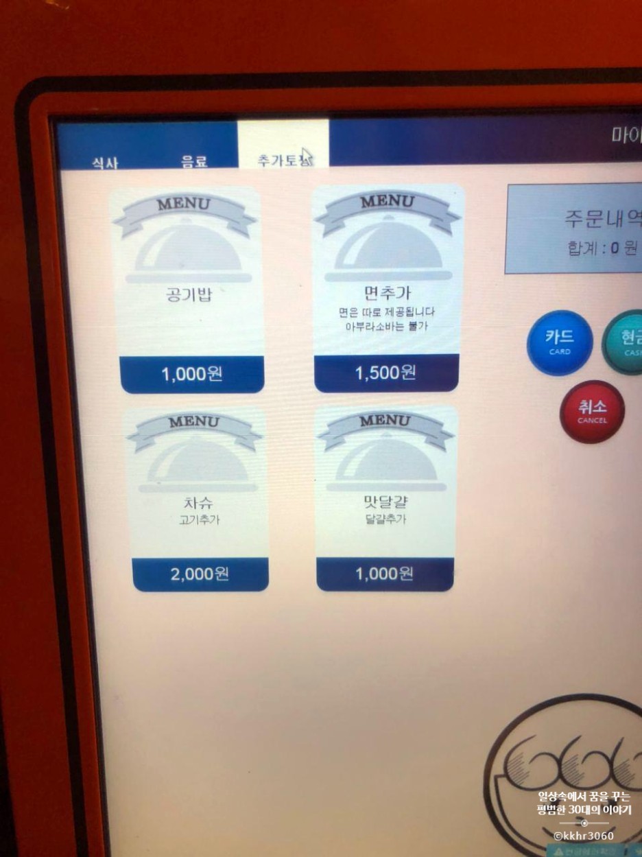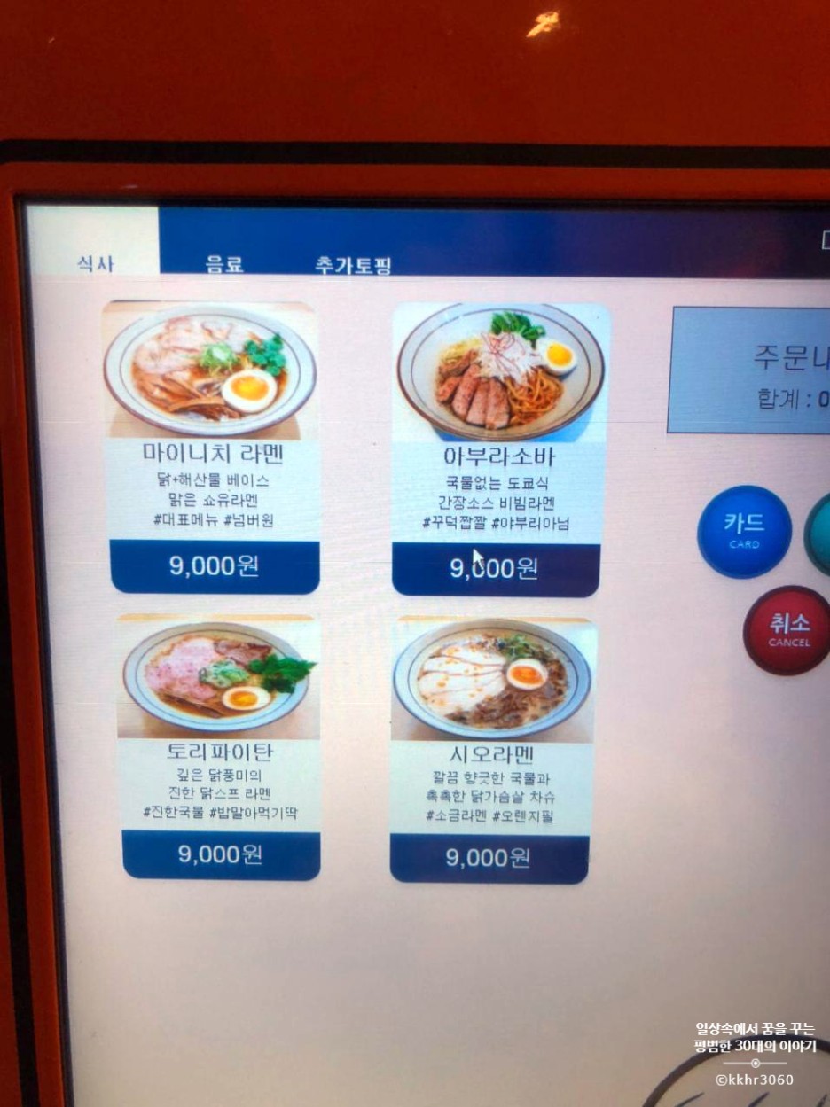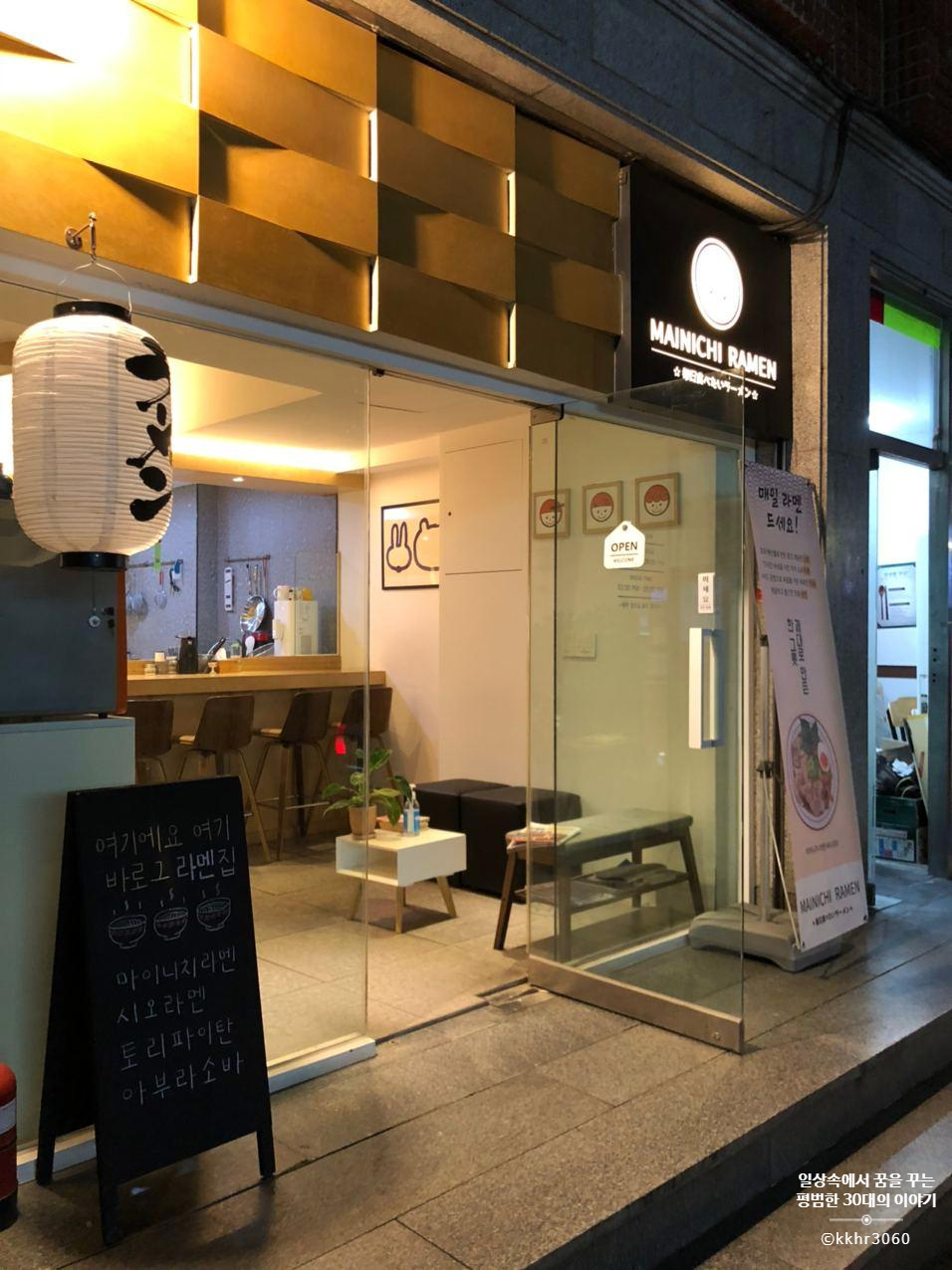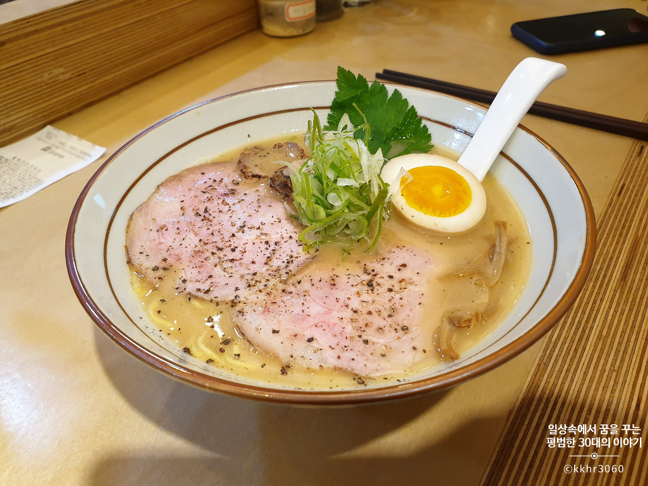 짝꿍이랑 매일 요리를 하는 저를 위해 일주일에 한 번은 외식을 하는데 이번 주 메뉴는 라멘! 날씨가 갑자기 쌀쌀해져서 스시를 먹기로 했던 마음이 저녁때쯤 싹 바뀌어서 급하게 정한 메뉴인 라멘! 평상시 외식 메뉴로 자주 먹는 메뉴는 아닌데 이날따라 따끈하고 느글느글한 일본라멘이 당겨서 급 식당을 알아보고 찾아간 곳이 마이니치 라멘이었다. 첫인상은 오픈한지 얼마 안 된 듯 내부와 외부 모두 단정하고 깔끔했다. 먹고 나서 이 포스팅을 하기 위해 찾아보니 오픈한지 얼마 안 된 가기는 아니더라. 그냥 사장님께서 매장관리를 잘 하셔서 그래 보였던 거로.. 입구로 들어서자마자 왼쪽에 무인주문기가 있어 맑은 소유라멘인 마이니치 라멘(9000원) 하나와 닭 수프 라멘인 토리파이탄(9000원) 하나를 주문했다. 먹다가 맛 달걀이 너무 맛있어서 1인 1개의 맛 달걀(1000원)을 추가해서 먹었다.