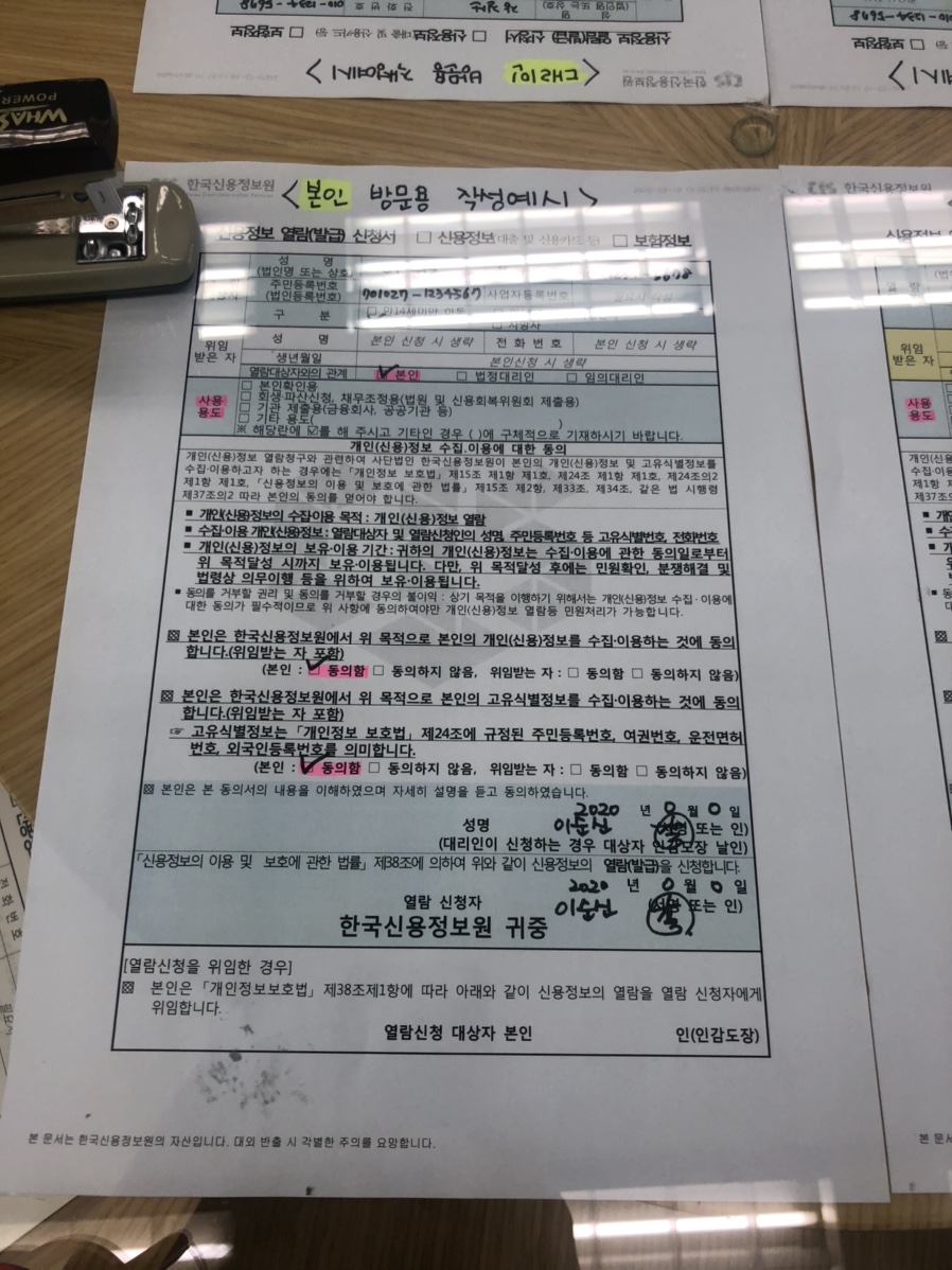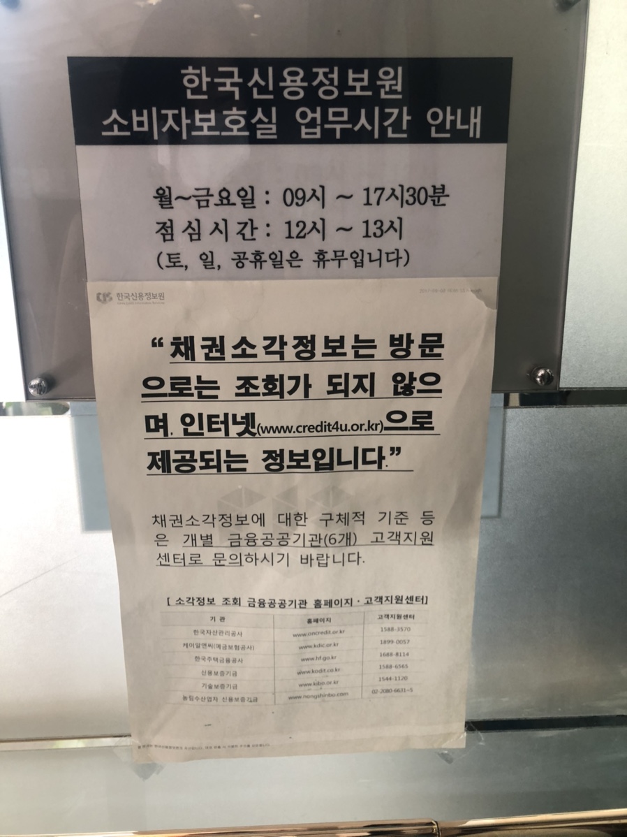 Credit4u 웹사이트에서 계속 발급받으려 했으나 계속 에러가 나는 바람에 결국 한국신용정보원에 직접 방문하여 발급받았다. 을지로 입구역 5번 출구에서 5분 거리에 있는 곳에 위치해있고 1층에서 신청서를 작성한 후, 신분증을 보여주면 그 자리에서 바로 발급해 준다.