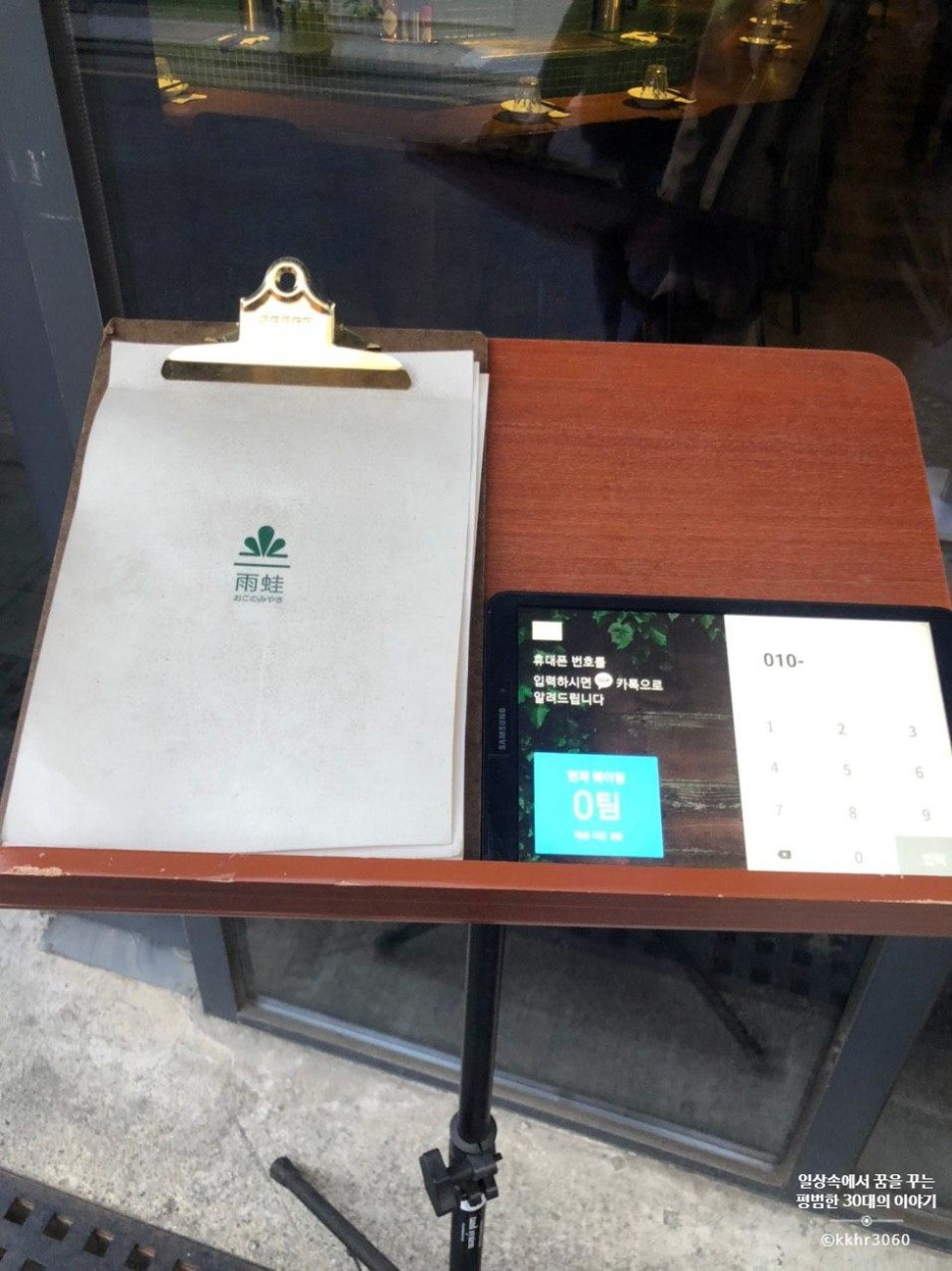 평일 저녁 7시쯤 방문했는데 사람이 아무도 없어서 식당을 잘못 고른 건가 싶어서 살짝 걱정이 됐었다는... 그런데 그건 나의 괜한 걱정이었다. 우리가 바좌석에 앉아 주문을 한지 얼마 지나지 않아 내부는 사람들로 금세 꽉 찼다. 개업한 지 얼마 안 된 식당 같았는데 흔히 식당에서 접할 수 있는 메뉴를 판매해서 그런지 사람들이 궁금증에 와보는 경우가 많은 것 같아 보였다. 자리에 앉으면 "우와에 처음 방문하시나요?"라고 종업원이 물어보시는데 시도 때도 없이 쫑긋 올라간 귀로 주변 대화를 들어보니 대부분 처음 방문한 고객들이었다.