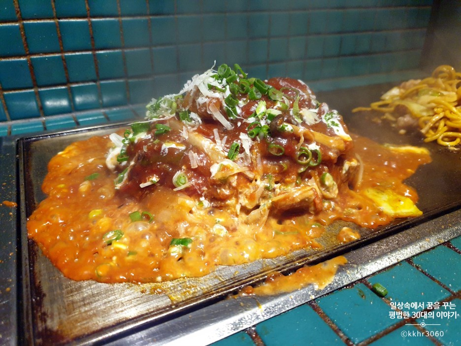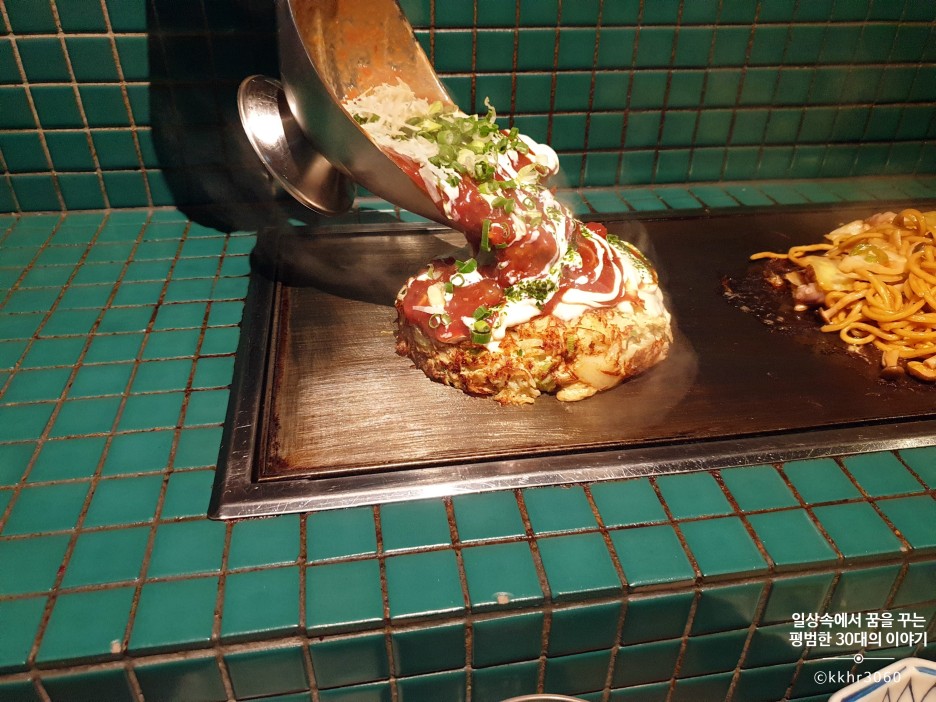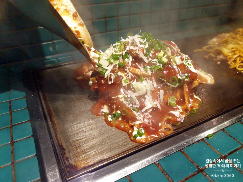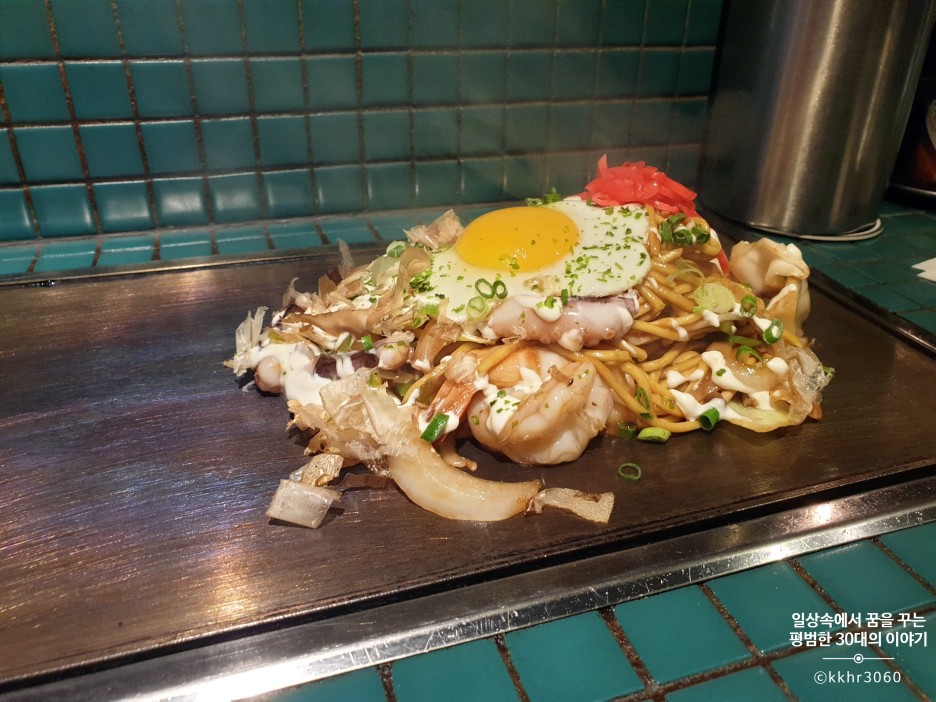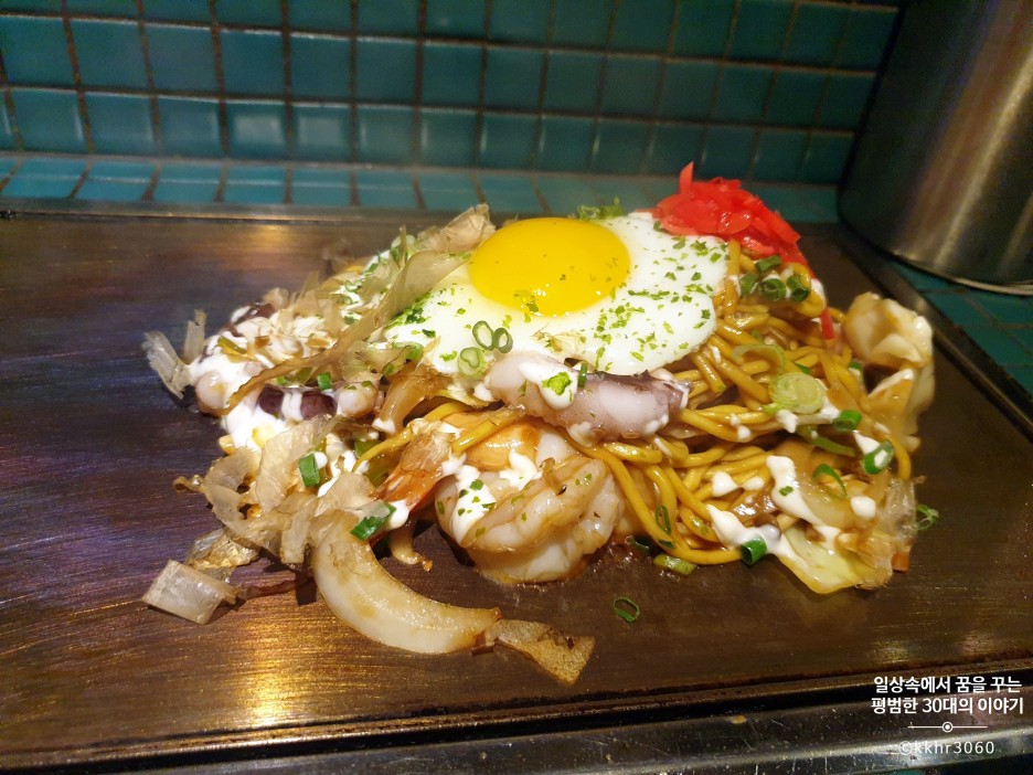 가장 먼저 나온 해산물 야끼소바! 통통한 새우와 낙지가 들어가 있는 자극적이지 않은 맛의 야끼소바였다. 주방에서 만들어진 야끼소바를 개인 철판 위에 올려놔 주신다. 이미 다 익힌 상태에서 제공되기 때문에 바로 먹을 수 있다. 맛은 내가 예상했던 그런 야끼소바의 맛이었다. 예전에 동생이랑 오사카 여행을 갔을 때 숙소 근처 허름한 가게에서 먹던 그런 깊은 맛이 나는 야끼소바는 아니었지만 그래도 너무 달거나 짜거나 하지 않아 균형이 잘 잡힌 소스의 맛이 나는 야끼소바였다. 약간 철판에 눌려있는 면을 먹는 것을 좋아하기 때문에 일부러 철판 위에 두고 천천히 먹었다.