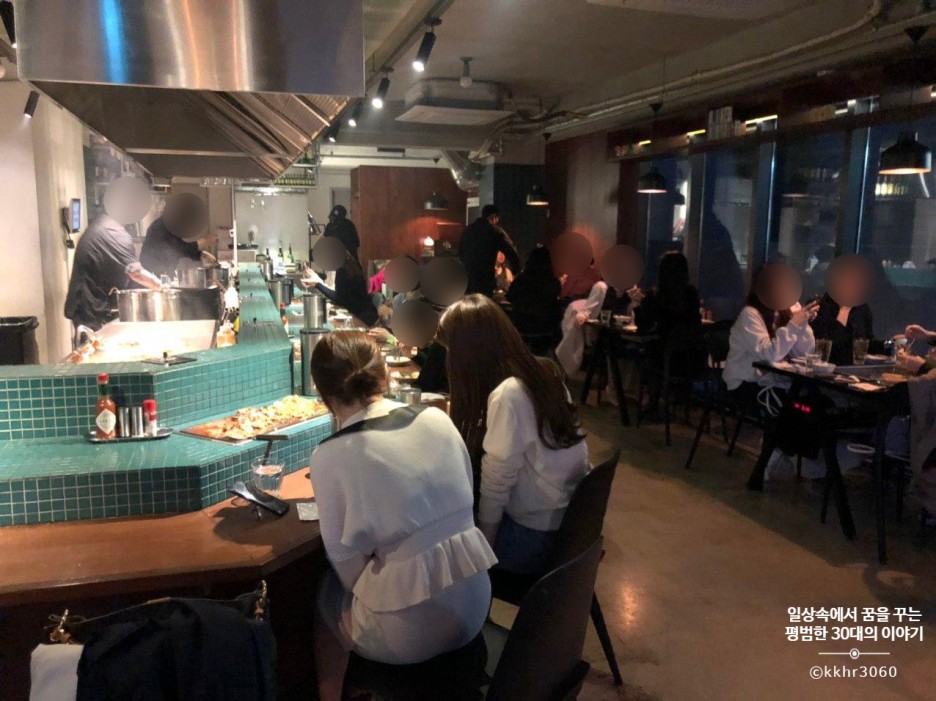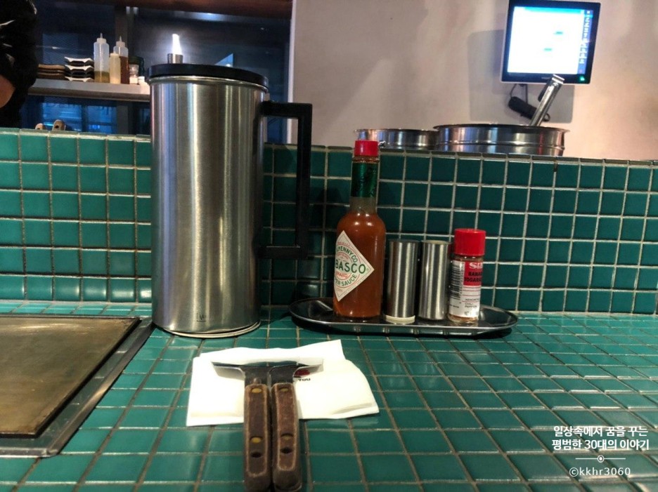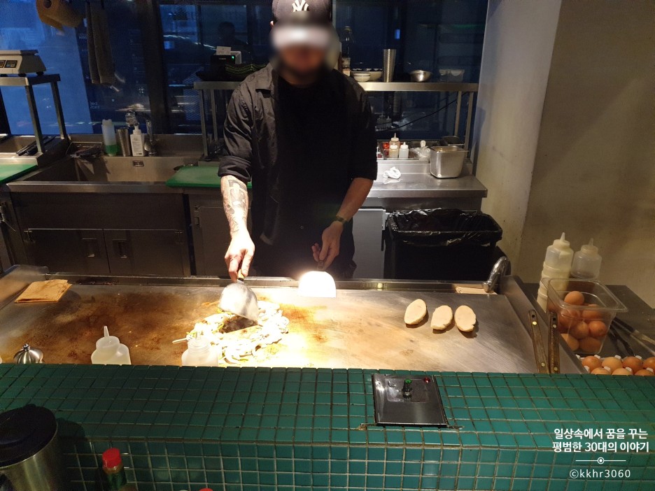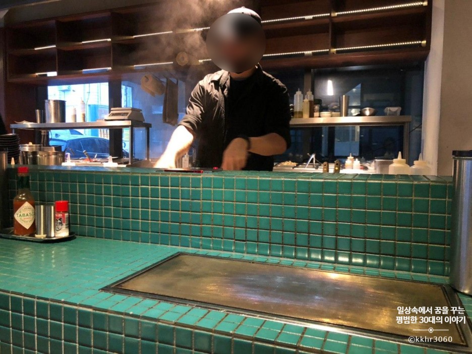 나는 어딜 가든 주방이 들여다보이는 좌석을 선호해서 오늘도 주방 앞 바 좌석에 앉았다. 좌석마다 좌석 앞에 개인 철판이 마련되어 있어 시간이 지나도 음식을 따뜻하게 먹을 수 있어 좋았다.