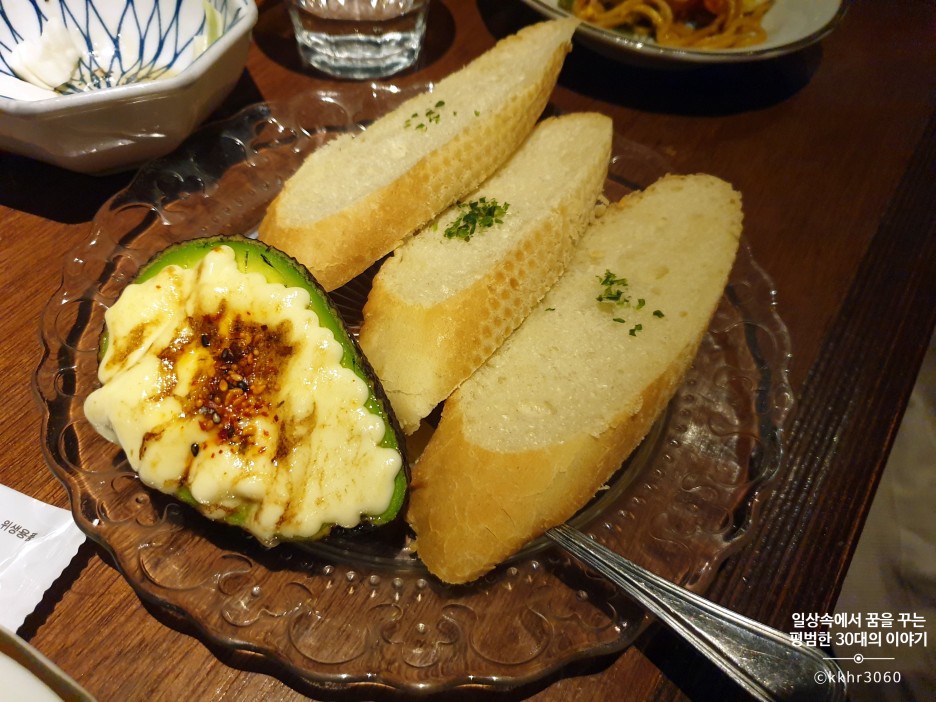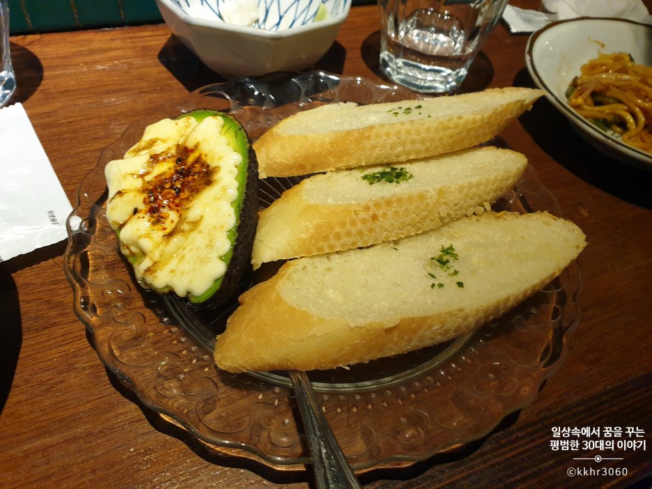 마지막으로 나온 아보카도멘타마요&바게트(3ea) 메뉴! 아보카도, 명란 마요 그리고 마요네즈를 섞어 만든 소스를 바게트 위에 올려서 먹는 건데 기대가 커서 그랬는지 내 입맛에는 살짝 비렸다. 아마 오코노미야키와 야끼소바를 먹느라 먹는 타이밍을 놓쳐서 그랬는지도 모르겠다. 나오자마자 따뜻했을 때 먹어야 했는데 살짝 식은 다음에 먹었더니 명란의 비린 맛이 확 올라왔다. 맛 자체는 나쁘지 않았으나 추천 메뉴라고 할만한지는 사실 잘 모르겠다. 특히나 바게트 맛이 조금 아쉬웠는데 바게트를 좀 더 바삭하게 구우면 좋지 않았을까 하는 아쉬움이 있다. 다음에는 꽃 갈빗살을 먹어볼까? 단품 요리가 별로 특색이 없고 종류가 많지 않아 좀 더 보완됐으면 좋겠다는 개인적인 생각.