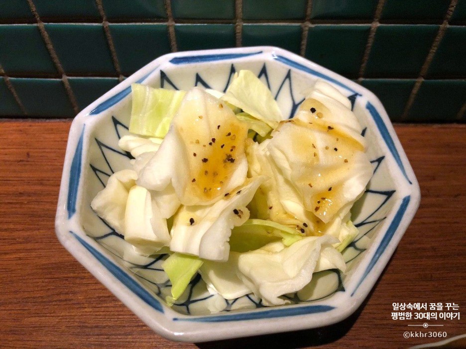 주문한지 얼마 되지 않아 기본 반찬인 양배추 샐러드가 나왔다. 별게 아닌데 나는 이게 참 맛있더라. 양배추 자체가 달달하니 아삭아삭해서 소스가 없이 그 자체로도 맛이 있다.