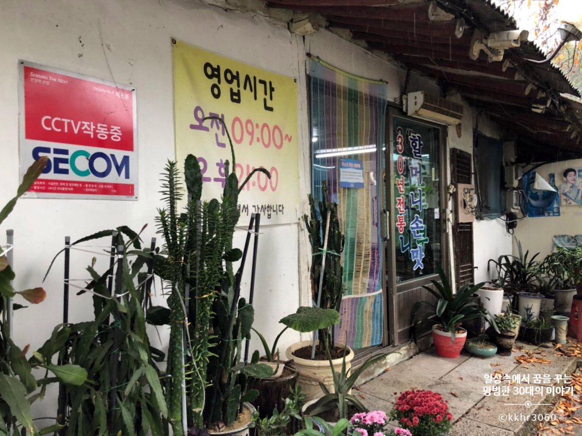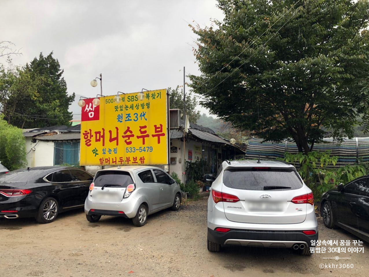 전날 연천에서 캠핑을 한 후, 느지막하게 체크아웃을 했다. 그냥 집에 가기는 아쉬워 맛있는 점심이라도 먹고 가자고 하여 가게 된 원조 3대 할머니 순두부! 아무것도 없는 조용한 시골마을인데 신기하게도 이 식당 주변으로 식당이 꽤나 많이 있다. 어쨌든 우리는 이 식당으로 처음부터 정하고 온 것이기 때문에 직진! 겉보기에 굉장히 허름해 보인다. 큰 길에서는 건물의 정체를 제대로 볼 수가 없어 내가 제대로 찾아온 게 맞나 싶었지만 식당 앞에 주차되어 있는 수많은 차를 보고 나니 이 집이 맞구나 싶었다.