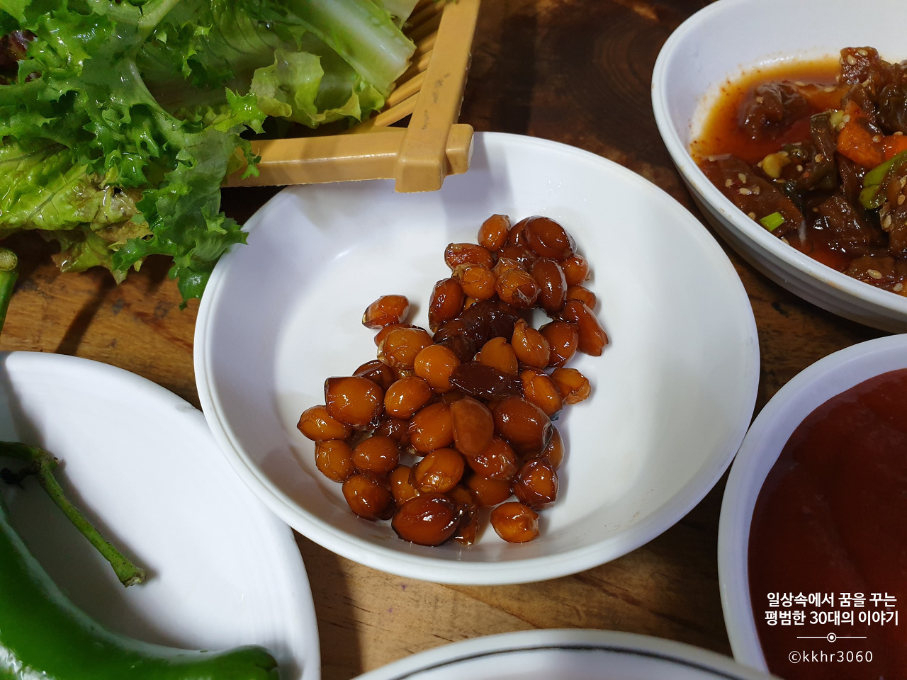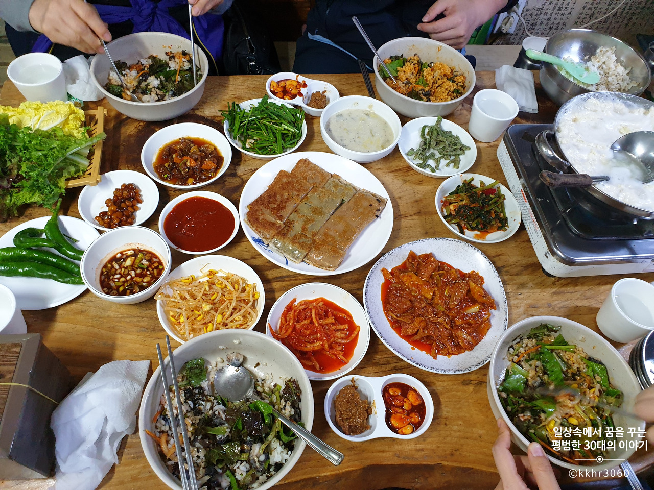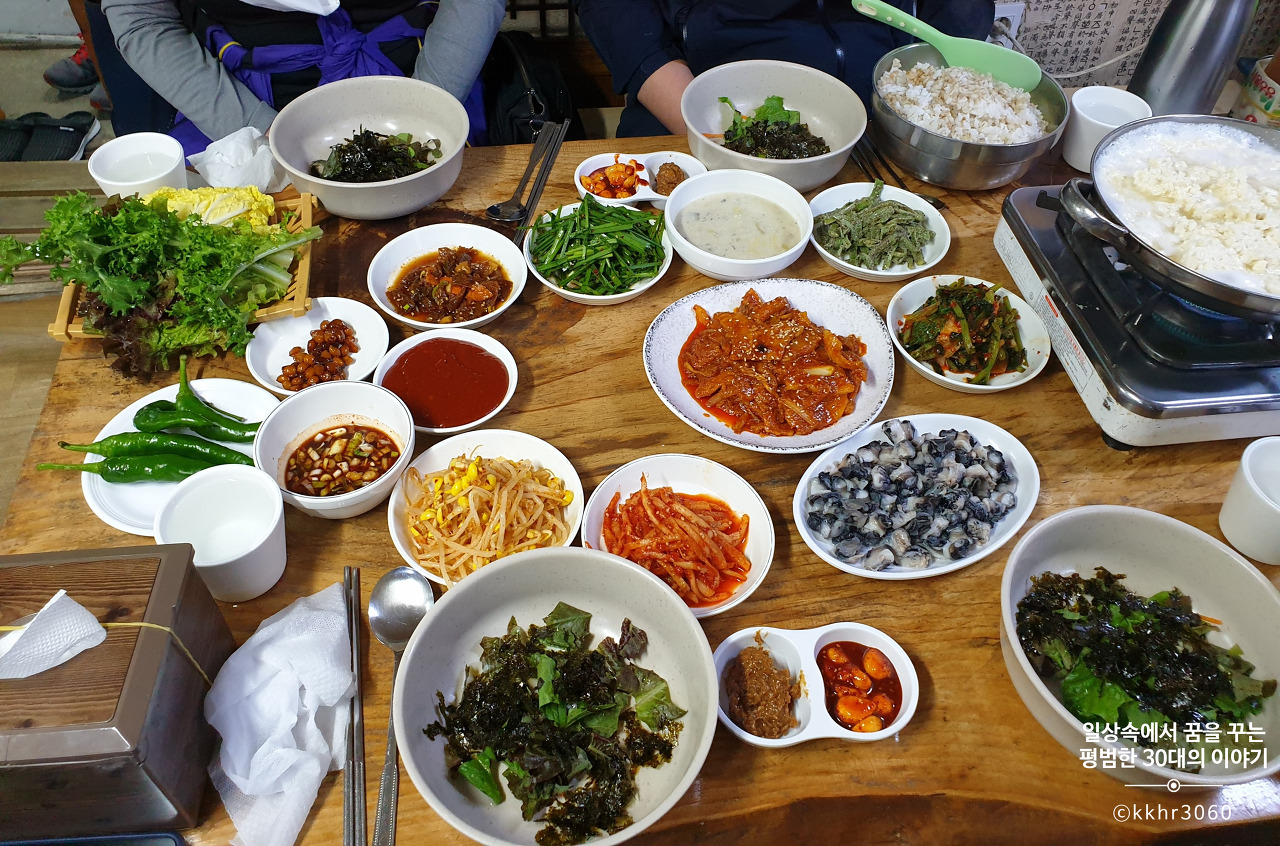 신선한 야채, 직접 만든 쌈장과 마늘고추장은 셀프로 무한정 먹을 수 있다. 이 집 고추장과 된장이 참 맛있다. 사고 싶은 마음이 잠깐 들었으나 집에 할머니가 직접 만들어서 주신 된장이 생각나 실제 사지는 않았다. 주문하자마자 얼마 되지 않아 순두부가 나오고 큰 양은그릇에 보리밥이 가득 담아 나왔다. 순두부는 직접 자리에서 끓여먹으면 된다. 보리밥은 각자 그릇에 먹을 만큼 덜어 7가지 반찬, 삶은 우렁이 그리고 제육을 넣고 비벼 먹으면 된다. 반찬이 하나하나 다 맛있었다. 이 날이 첫 방문이라 그때그때 반찬이 바뀌는지는 모르겠다. 된장찌개는 맨 마지막에 나왔는데 직접 담근 된장으로 끓인 된장찌개라 더더욱 맛있었다. 어찌나 구수하던지!!! 오히려 메인메뉴인 제육이 찬밥 신세였던 날이다. 순두부와 제육 맛집은 아닌 걸로.. 사실 두부가 먹고 싶어 온 거였는데 순두부는 오히려 지극히 평범한 맛이었다. 물론 순두부를 특별히 맛있게 만들기도 어려울 듯.