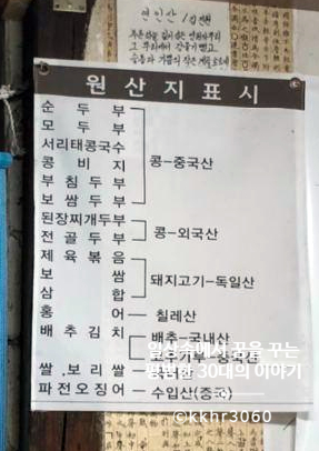오늘도 식당에 들어서자마자 원산지 표시를 두리번거리면 찾았다. 큼지막하게 벽에 걸려있더라. 국내산은 배추, 쌀, 보리쌀뿐이다. 대부분이 중국산이라 아쉬움이 크다.