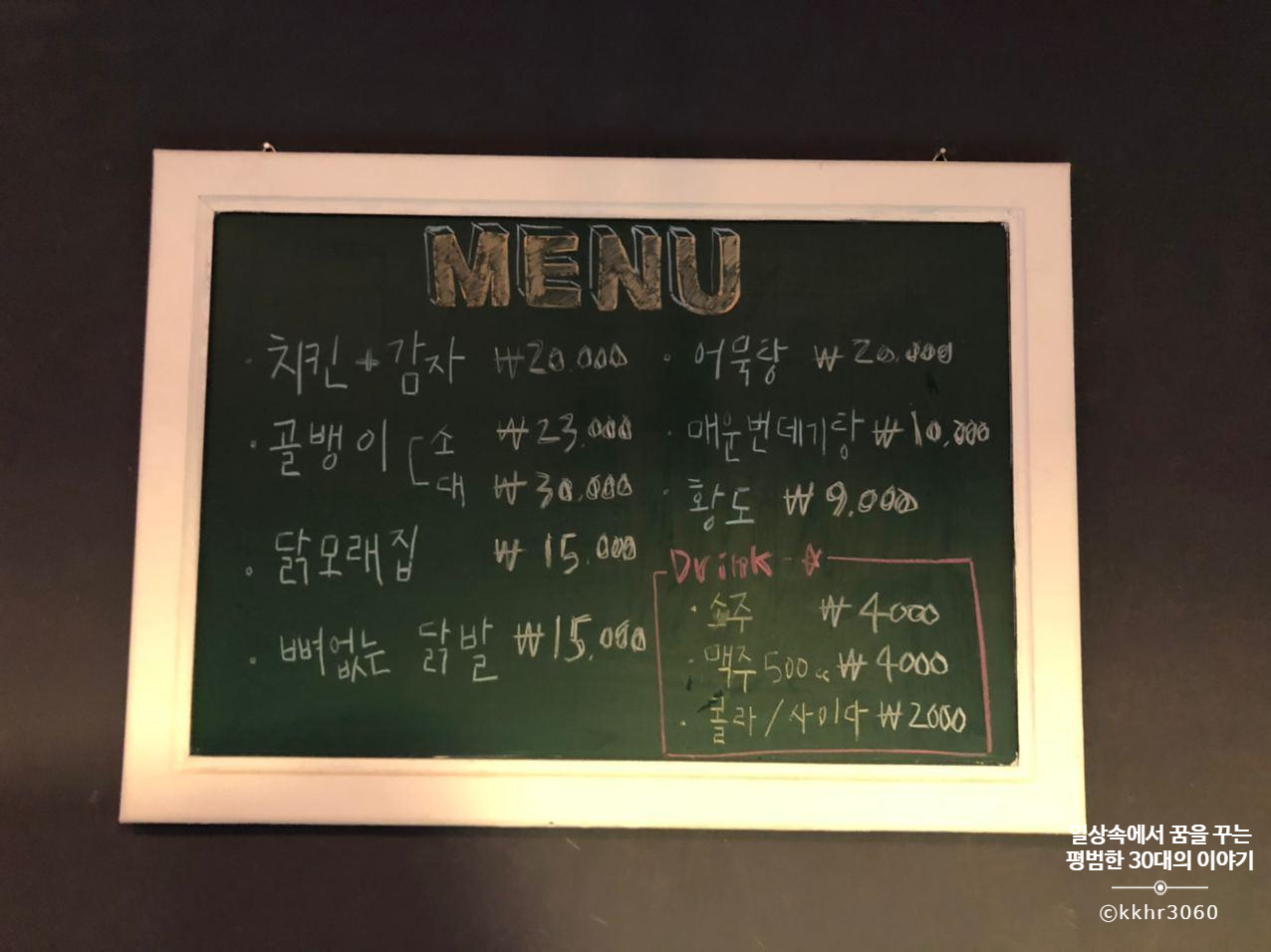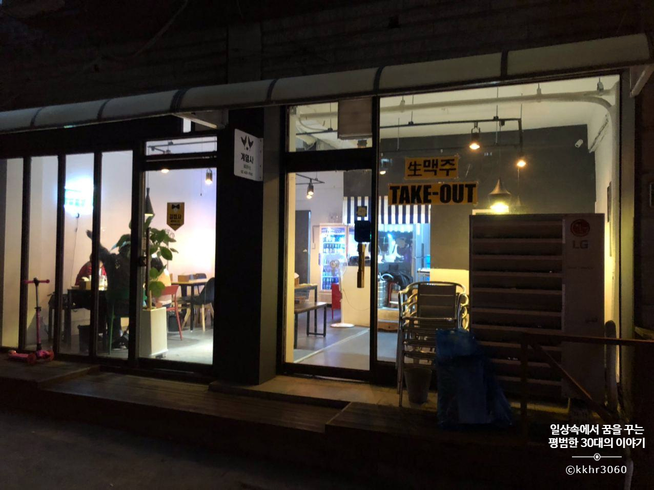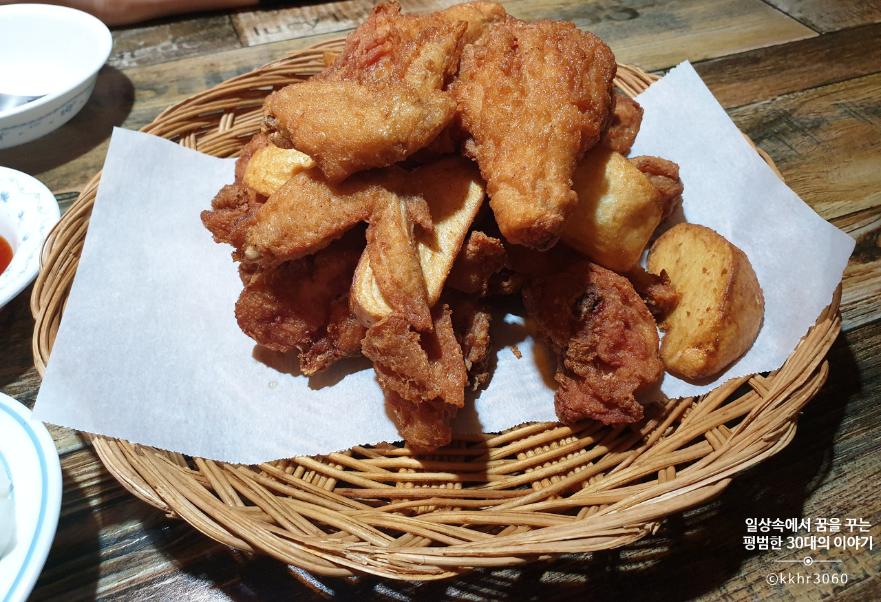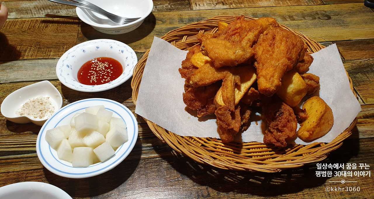 조금 이른 저녁이지만, 치킨을 그리워(?) 하는 짝꿍을 위해 저녁을 계열사에서 먹고 가기로 했다. 끝도없이 이어지는 아파트 대단지를 가로질러 걸어가다 보니 한적한 빌라촌이 나왔는데 그곳에 식당과 카페가 몰려있었다. 딱 보기에도 생긴 지 얼마 안 된 깔끔한 치킨집이었다. 메뉴는 부암동에 있는 계열사 본점과 조금 달랐지만 기본적인 건 다 있었다.