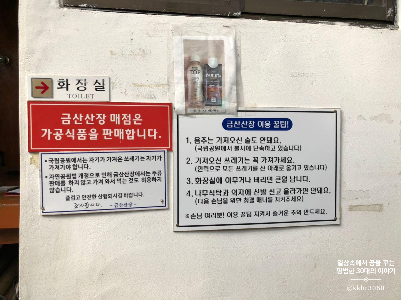 금산산장에서 판매하는 메뉴는 사람이 여기까지 직접 지고 가져오는 것이기 때문에 그 생각을 하면 비싼 게 절대 아니다. 산에 있는 식당이기 때문에 재활용도 철저하게 하더라.